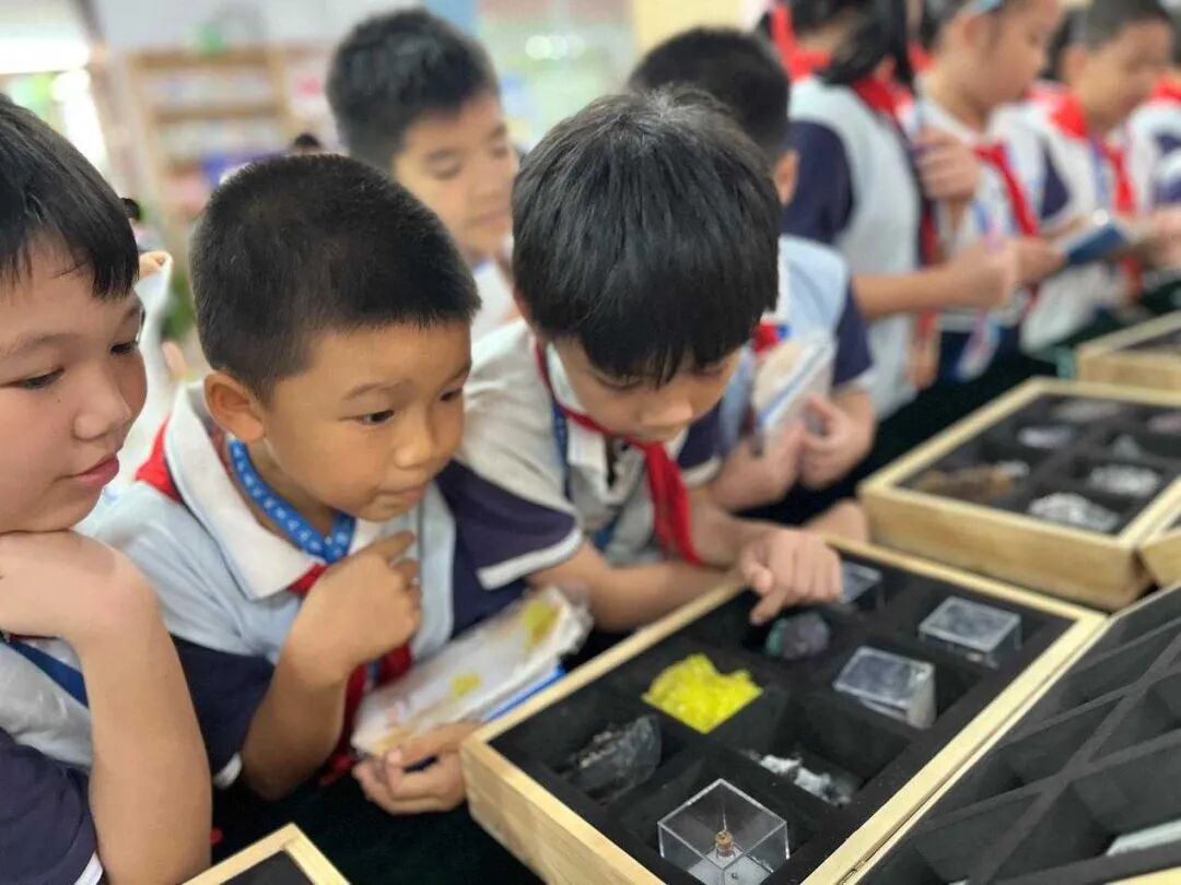 9月11日至13日,我区组织“自然资源科普边境行”走进崇左市大新县。图为孩子们认真观看矿物精品。