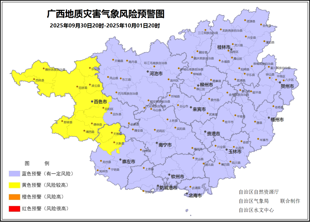 9月30日18时,自治区自然资源厅与自治区气象局、自治区水文中心联合发布地质灾害黄色预警:预报9月30日20时至10月1日20时,百色市右江区、田阳区、德保县、那坡县、凌云县、乐业县、田林县、西林县、隆林各族自治县、靖西市,崇左市大新县、天等县发生地质灾害的风险较高(黄色预警)。